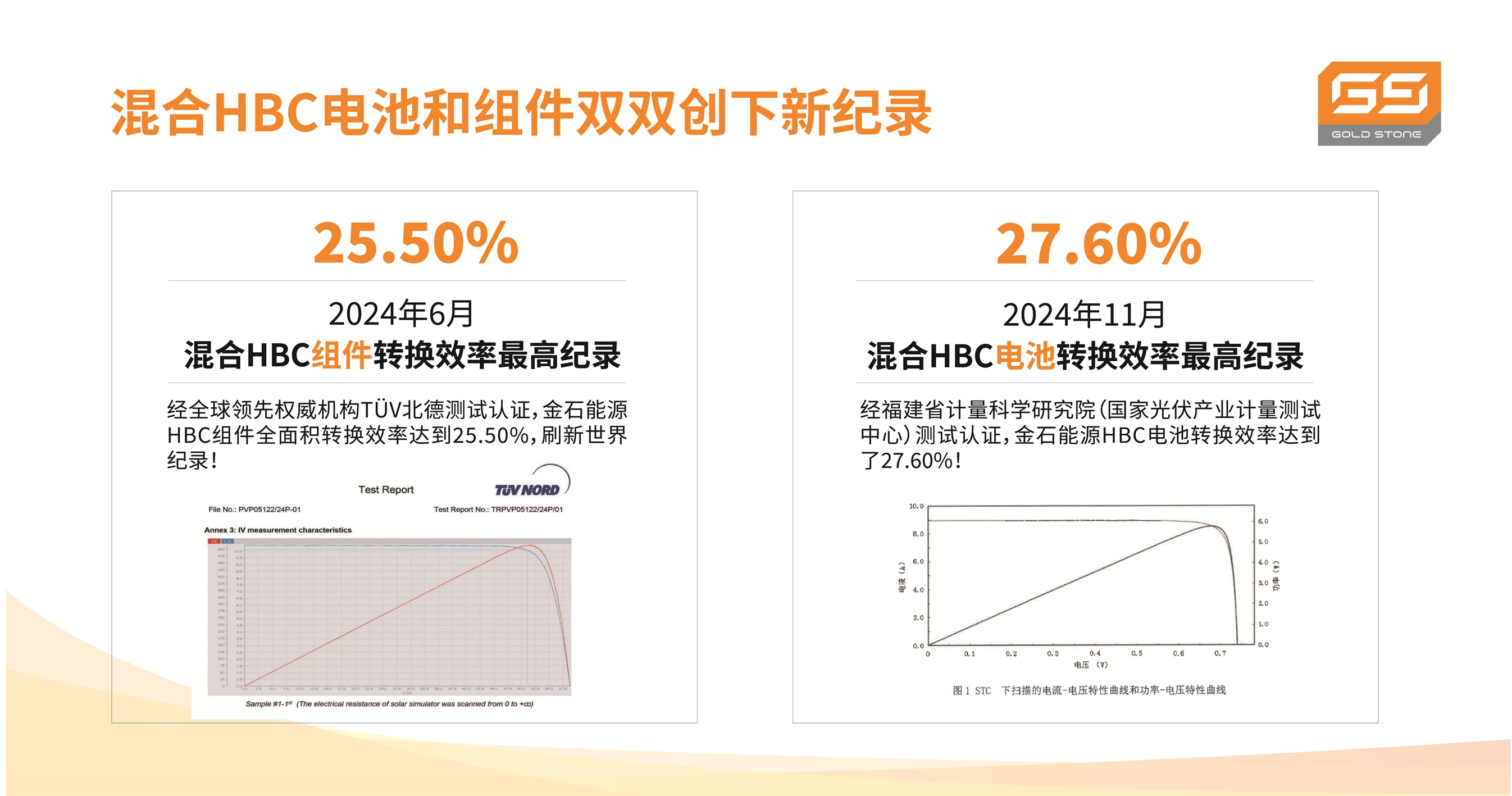 2024年11月,经福建省计量科学研究院(国家光伏产业计量测试中心)测试认证,金石能源混合HBC电池转换效率达到了27.6%!